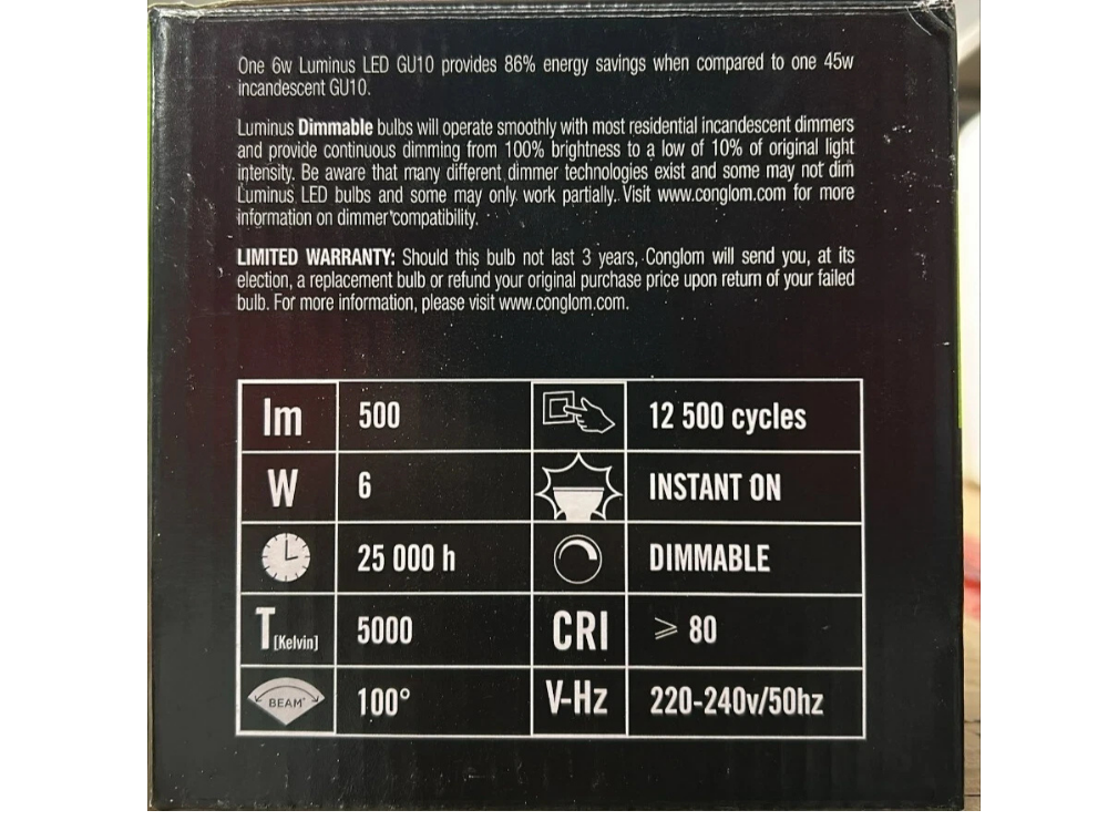 8x Luminus GU10 LED Downlight Bulbs – 6W Dimmable Daylight 5000K, 500LM