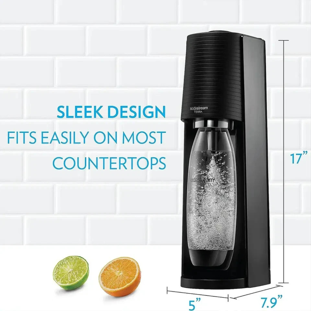 Transform plain water into refreshing sparkling water in seconds with the SodaStream Terra. Featuring new Quick Connect technology for fast CO2 cylinder installation, this sleek and cordless machine makes carbonation effortless with an ergonomic button and secure snap & lock bottle system.